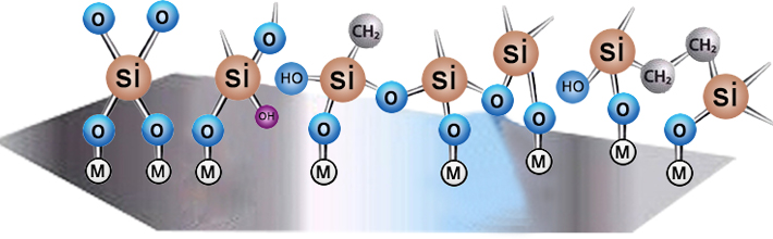 硅烷水解產物中的-SI-OH基因與金屬表面Me-OH基因形成氫鍵,快速吸附于金屬表面。